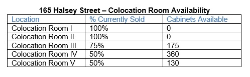 Even with the rise in leasing commitments, 165 Halsey Street still has availability for those in need of colocation services. Of 165 Halsey Street’s five Colocation Rooms, two are 100% occupied, with remaining data center availability in Colocation Rooms III, IV and V. 165 Halsey Street also offers more than 31,300 square feet of built data center space and 61,500 square feet of vacant space.