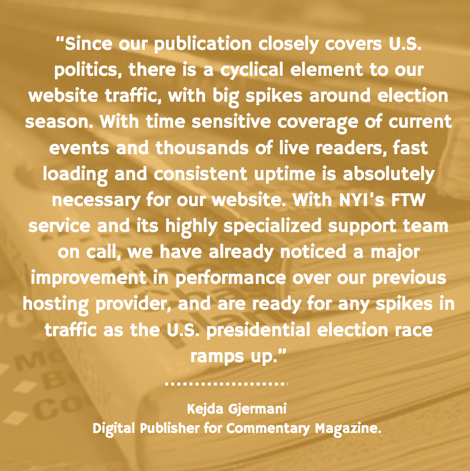 Magazine subscribers want their news and they want access to it around the clock. Thankfully for Commentary Magazine’s subscribers and over 500,000 monthly website visitors, NYI-managed hosting and Fault Tolerant Web (FTW) guarantee that the news they want access to is available 24/7/365. NYI’s services have ensured 100% uptime for the publishing company, which had been experiencing service degradation and unacceptable downtime with previous hosting providers.