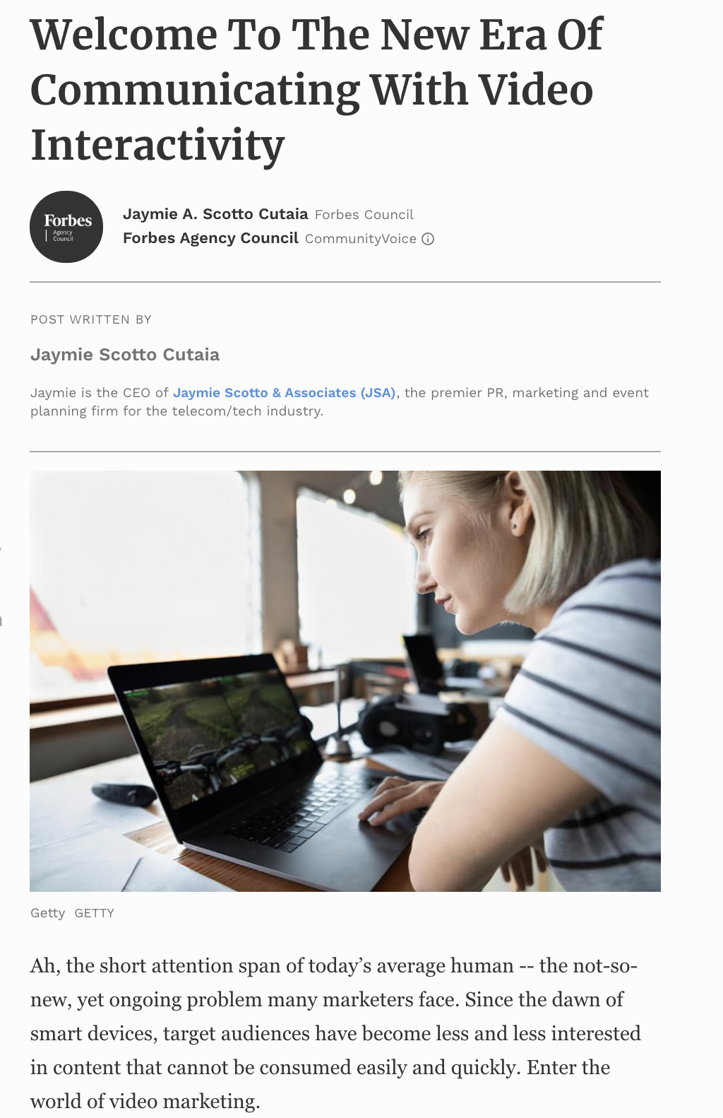 Jaymie Scotto Cutaia: This month’s Forbes article delves deep into the topic of video interactivity. We’ve known for some time that videos are hot, and are now widely adopted by marketers. But now, we face a new challenge. As marketers, not only do we have to present information to target audiences, but also truly engage with them. While still an up-and-coming trend, interactive video takes this already-established medium to the next level, as so well exhibited in JSA Account Manager Carl Sketchley‘s article. Carl, what inspired you to write this piece?