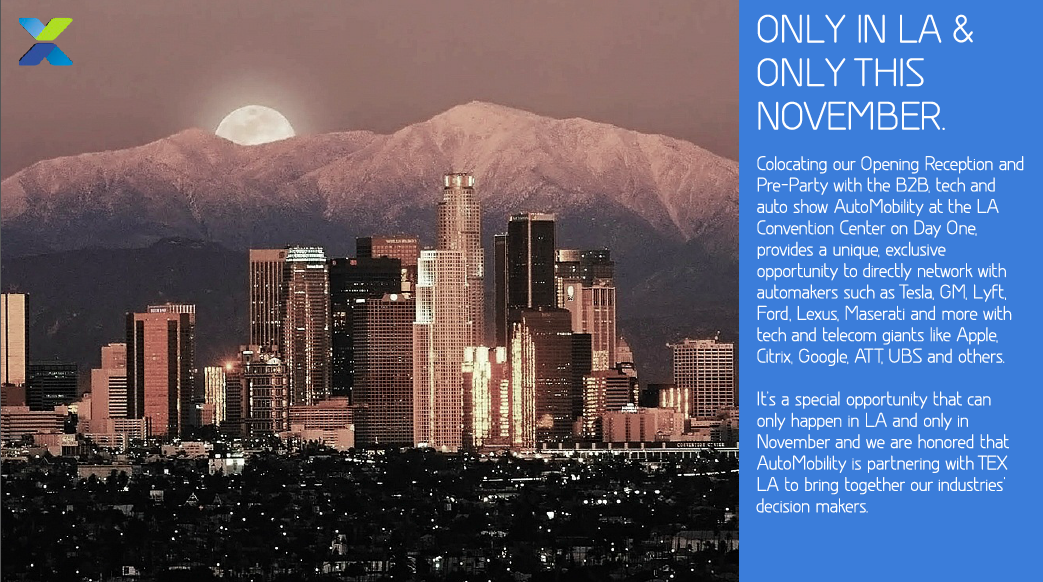 We are a few weeks away from Telecom Exchange (TEX) LA, the must-attend networking event this fall, kicking off with the Opening Reception on Monday, November 14th! The TEX LA Opening Reception will take place starting at 5 pm at the Technology Pavilion in the Los Angeles Convention Center on November 14th. The unique and exclusive two-hour event serves as a key opportunity for telecom network operators to network directly with major automakers as well as tech and telecom giants. AutoMobility LA precedes the ten-day public Los Angeles Auto Show, and was created as the new auto industry’s first
